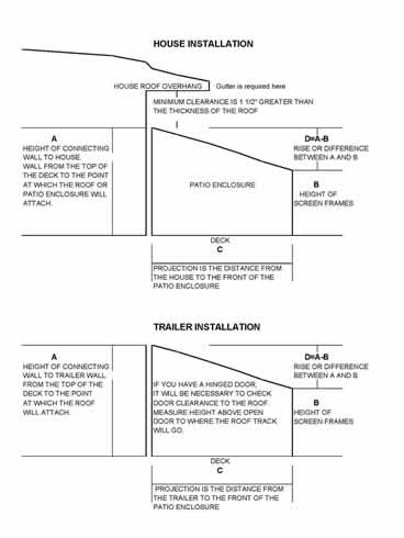 The normal screen frame height (B) is 74″. If the people using the Screen Room, Patio Enclosure are tall, one may wish to consider purchasing the optional height screen frames. In order to have proper water run-off from the roof a minimum slope is required. This slope is determined by a combination of the height of the screen frames and the projection of the Screen Room, Patio Enclosure. Projection is the distance one would walk away from the house or trailer to which the Screen Room, Patio Enclosure is attached.