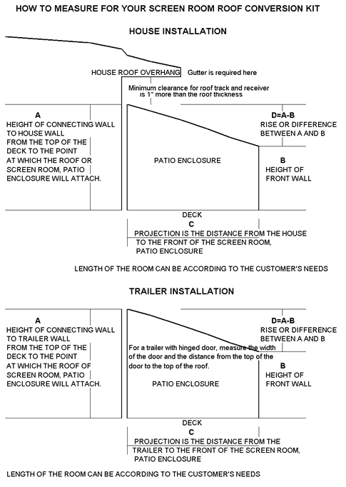 The normal screen frame height (B) is 74″. If the people using the Screen Room, Patio Room are tall, one may wish to consider purchasing optional (B) higher screen frames. In order to have proper water run-off from the roof a minimum slope is required. This slope is determined by a combination of the height of the screen frames and the projection of the Screen Room, Patio Room. Projection is the distance one would walk away from the house or trailer to which the Screen Room, Patio Room is attached.