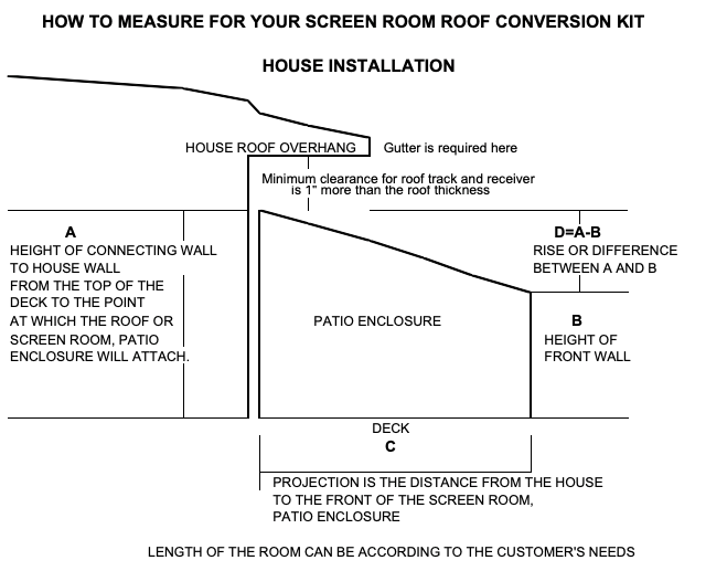 The normal screen frame height (B) is 74″. If the people using the Screen Room, Patio Room are tall, one may wish to consider purchasing optional (B) higher screen frames. In order to have proper water run-off from the roof a minimum slope is required. This slope is determined by a combination of the height of the screen frames and the projection of the Screen Room, Patio Room. Projection is the distance one would walk away from the house or trailer to which the Screen Room, Patio Room is attached.