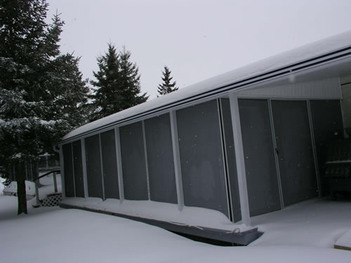 Extrusions are used to surround the gable end material (1 3/4″ thick insulated material) on the side screen frames, to fully enclose the room. The connection to the screen frames eliminates screen frame movement in most windy conditions.
